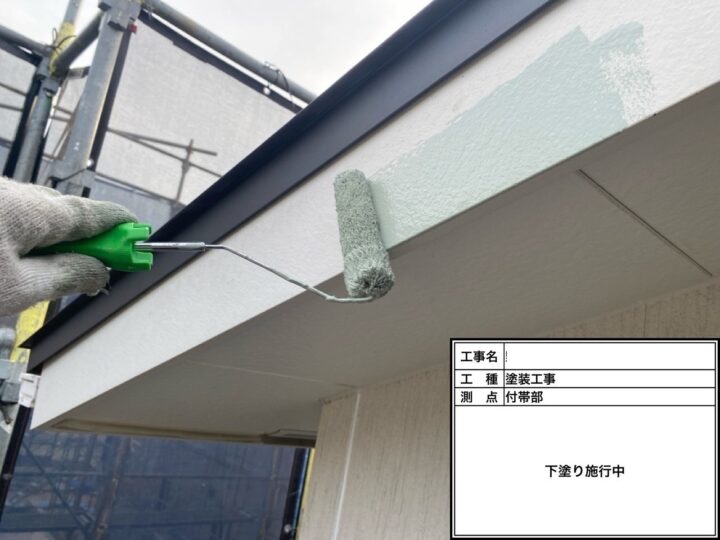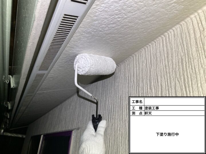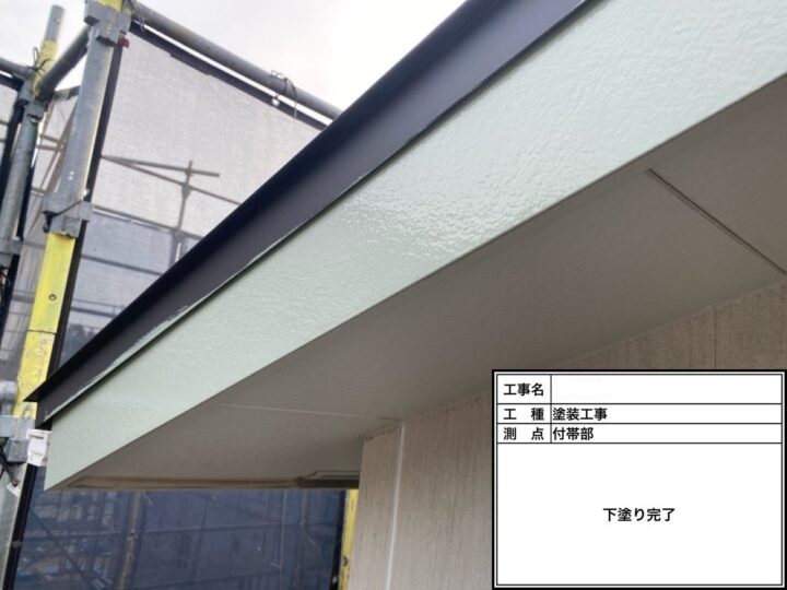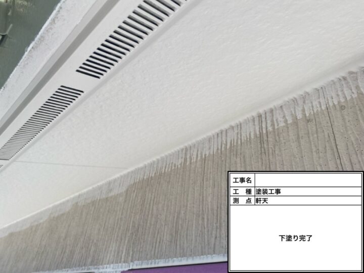 軒天塗装の上塗りの塗装が完了しました。外壁下塗り塗装
