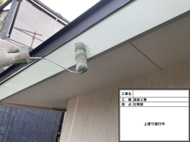 破風板の中塗りの塗装が完了しました。破風板上塗り塗装