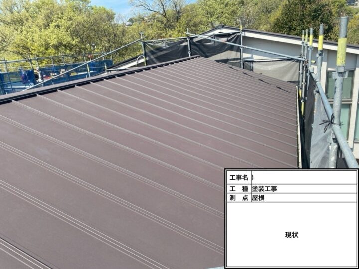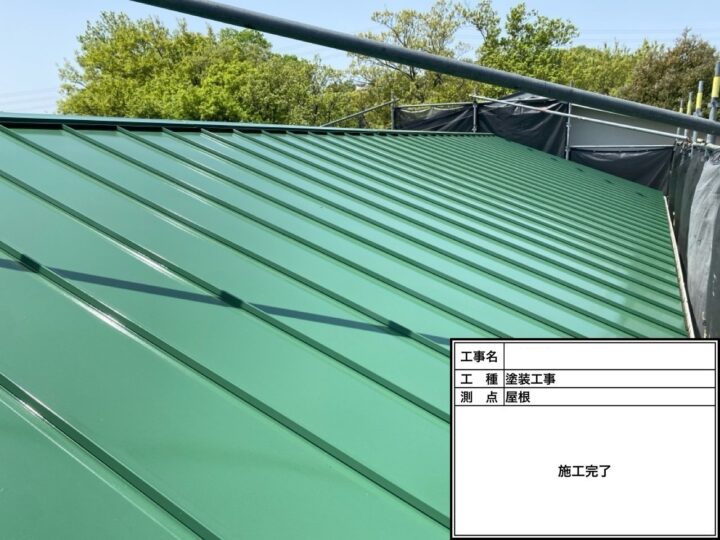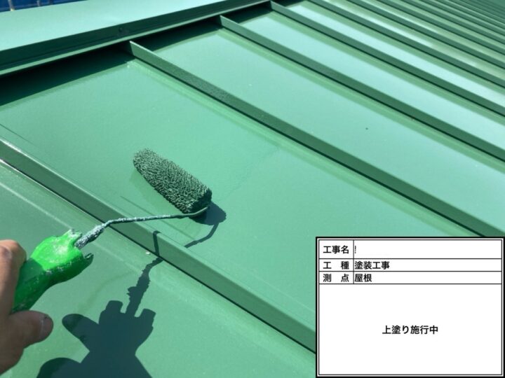 屋根の中塗りの塗装が完了しました。屋根上塗り塗装