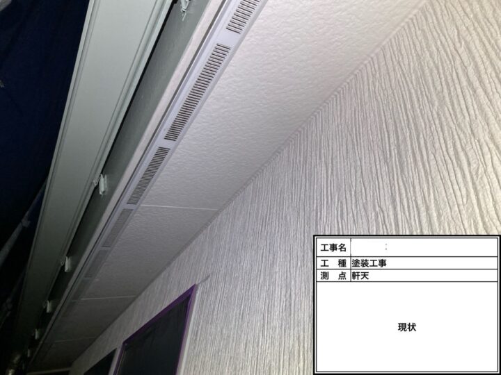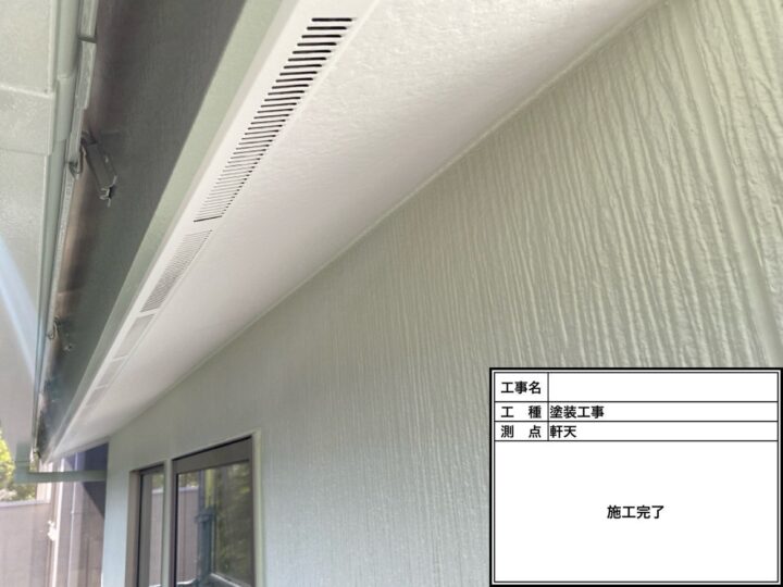 軒天塗装の中塗りの塗装が完了しました。軒天上塗り塗装
