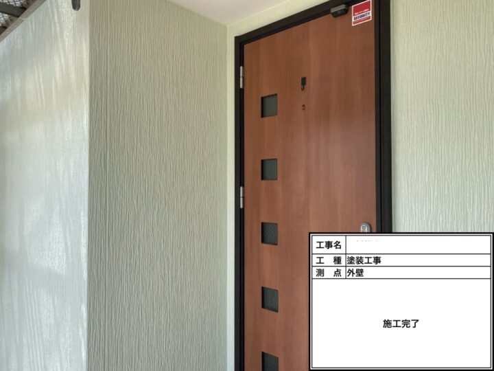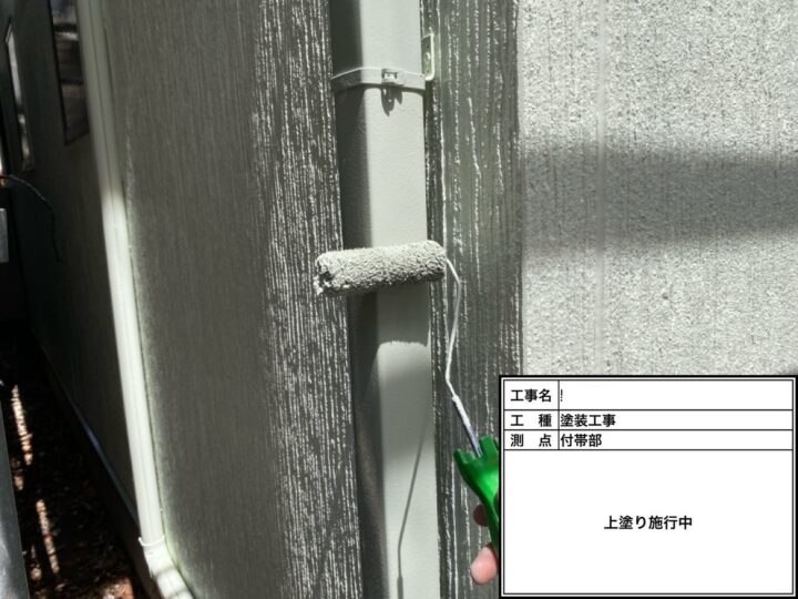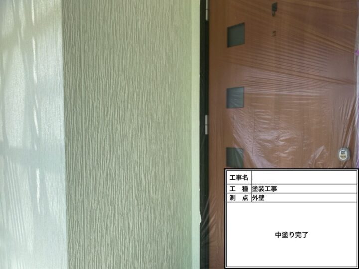外壁の中塗りの塗装が完了しました。外壁上塗り塗装