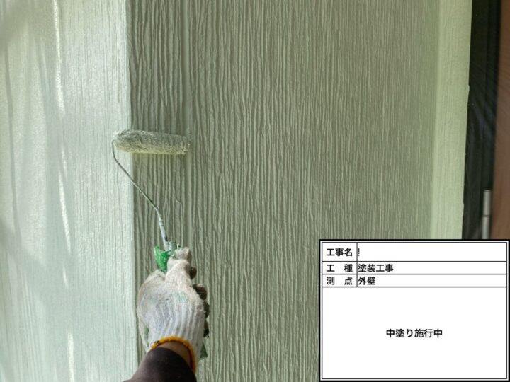 外壁の中塗りの塗装です。外壁中塗り塗装完了