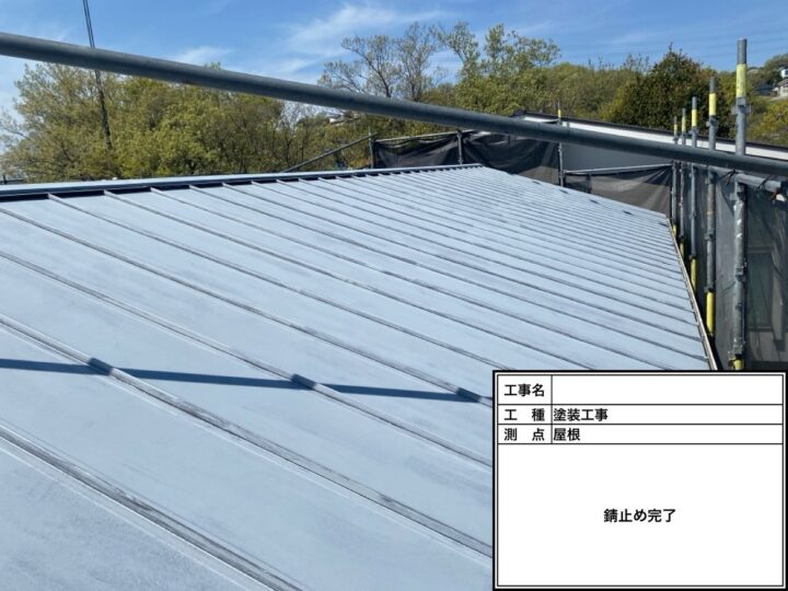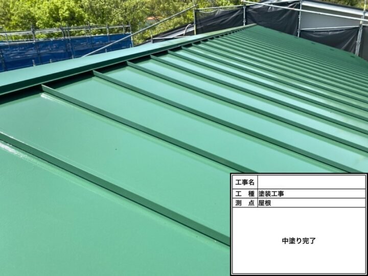 屋根の錆止めの塗装が完了しました。屋根中塗り塗装