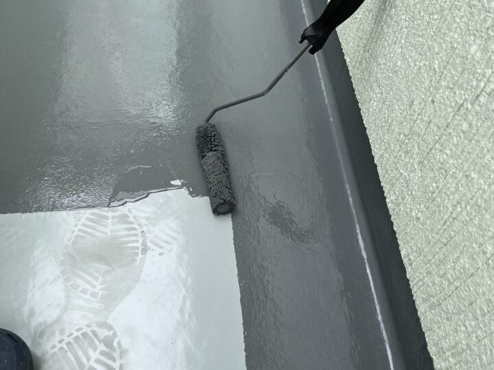 バルコニー防水主材2層目の塗装が完了しました。バルコニー防水トップコート塗装