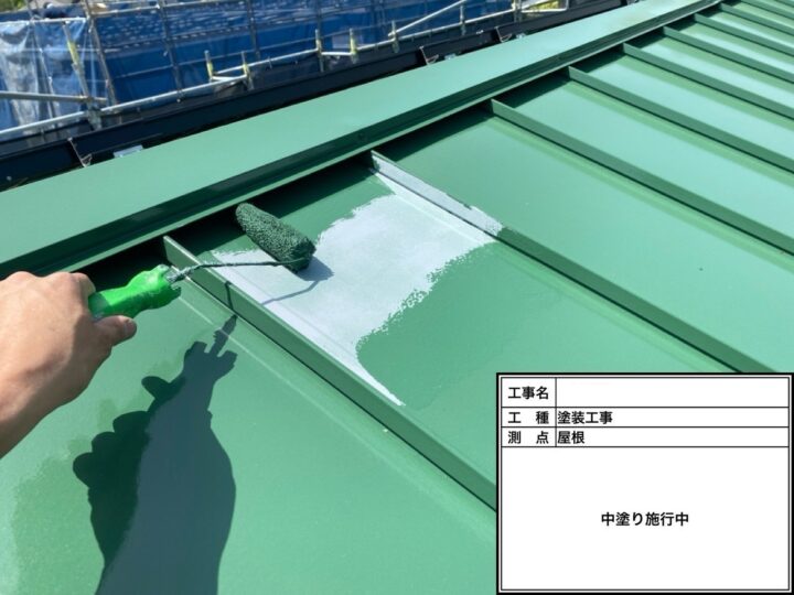 屋根の中塗りの塗装です。屋根中塗り塗装完了